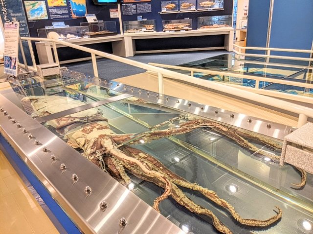 ジオパークの成り立ちやそこに暮らす生物に焦点を当てた自然博物館。小さな施設ですが、ミニ水族館や3Dシアターなど楽しめる要素は多いです。館内に横たわるダイオウイカの標本は、様々な角度からじっくりと観察できます。