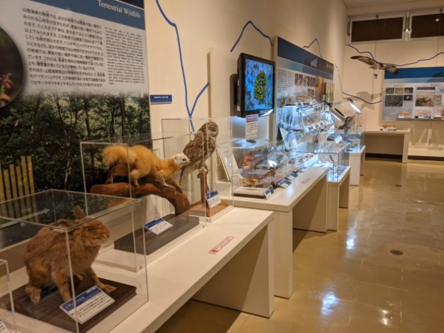 山陰海岸に暮らす生き物は剥製で展示。内陸部に暮らすテンやニホンノウサギ、さらに砂丘に暮らすスナガニなどが紹介されていました。