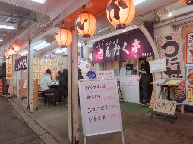 前述の通り、小樽駅より徒歩2分の三角市場にあります。駅前バスターミナルのバス待ち時間の調整で立ち寄っても良さそうですが、混雑してる可能性が高いです。