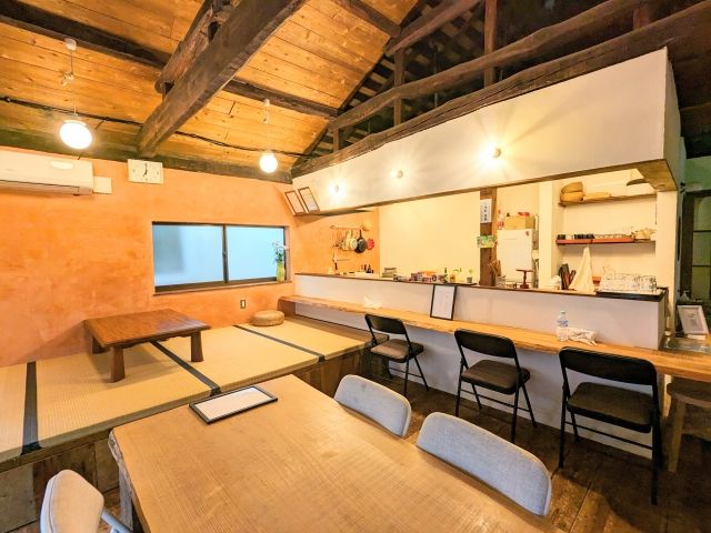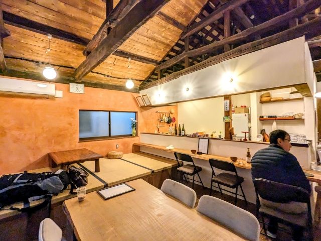 館内のラウンジにはカウンターがあり、まるでカフェバーみたい。インテリアも照明もとってもおしゃれですが、気取らない雰囲気で居心地の良さもあります。高い天井と、奥の部分が畳の座敷になっているのが良いですね。
