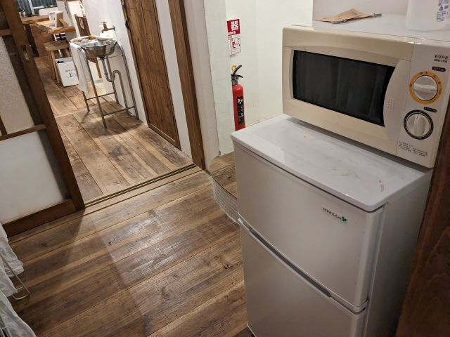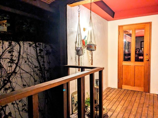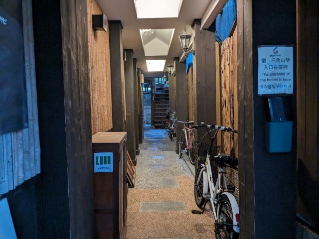 ゲストハウスは居酒屋さんの2階にあります。入口はちょっとわかりにくいですが、居酒屋脇の細い通路を抜けた先、階段を登ったところにあります。なんだか秘密基地みたいでワクワクしてきました。