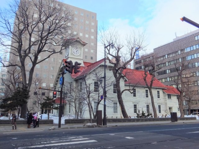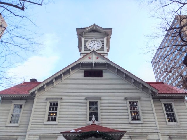 札幌の市街地ど真ん中にある札幌市時計台。まっしろな壁と赤い屋根、そしてその上に乗った時計がレトロでかわいらしい木造洋風建築です。