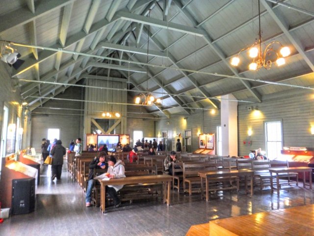 館内は思ったよりも広々。合掌構造で支えられる屋根は、柱のない開放的な空間を作り上げています。