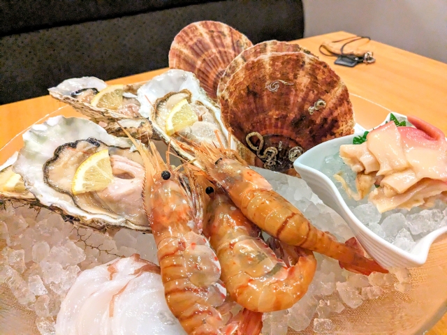 さらにテーブルサービスとして「季節の海鮮盛り合わせ」も!大きなお皿にたっぷりと盛りつけられた新鮮な海鮮・・・贅沢すぎる一皿です。内容はその日によって変わるようですが、このときはホタテ・カキ・ボタンエビなどが盛り付けられていました。