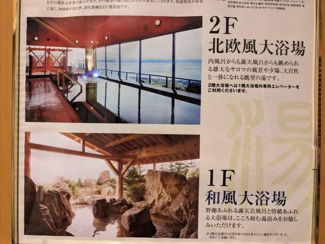 大浴場は「和風」と「北欧風」の2ヶ所あります。日にちによって入れ替わるので、夜と朝で入浴すれば両方楽しむことができます。