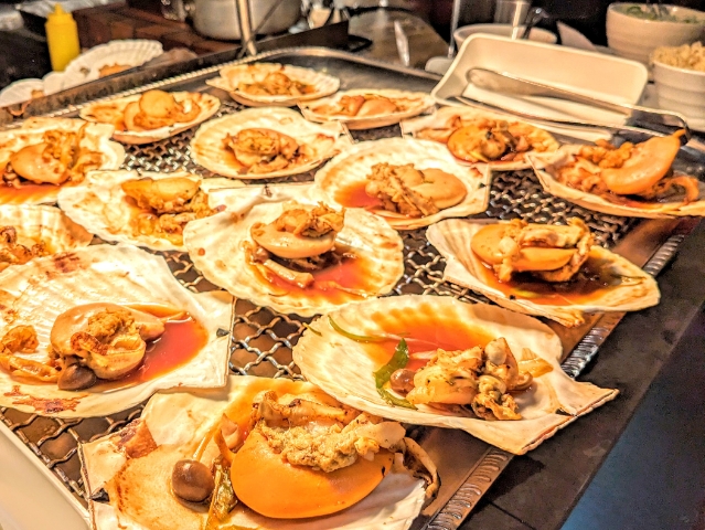 夕食は、レストラン ラ・メールにてビュッフェスタイル。ライブキッチンもあり、焼き立てステーキや天ぷら、ホタテ浜焼きなど、いろいろなメニューが揃っています。