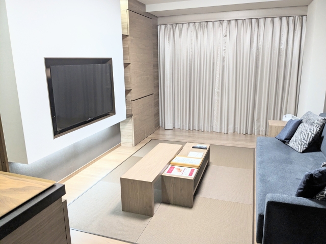今回宿泊させていただいたのはこちらのお部屋。壁に埋め込まれたテレビやモダンな家具がおしゃれなリビングルームがあります。