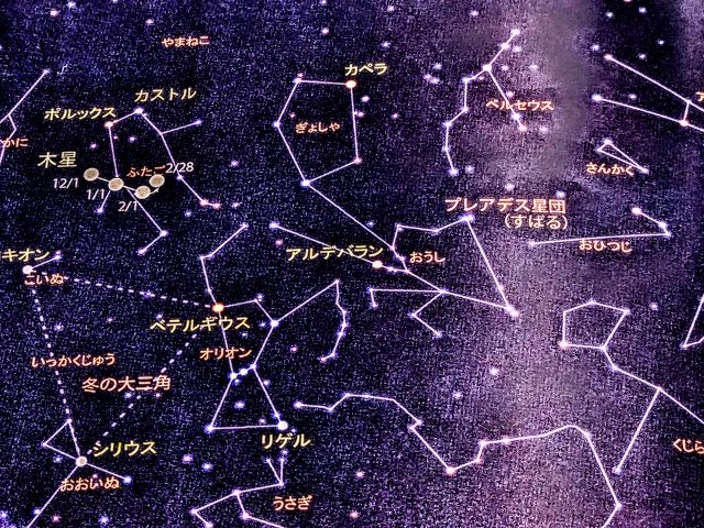 富士山やスカイツリー、武蔵小杉のビル群など、ここから見える景色に始まり、冬の夜空の解説へ。日が暮れると様々な星座の紹介オリオン座の「ペテルギウス」、おおいぬ座の「シリウス」、こいぬ座の「プロキオン」からなる冬の大三角、今見える「木星」や「プレアデス星団」など、様々な星を紹介してくれます。