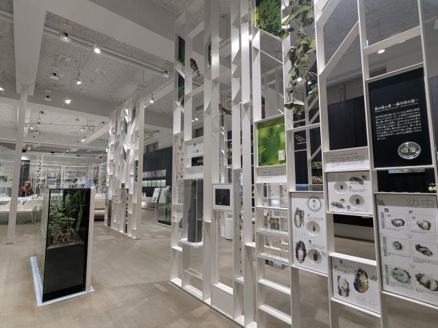 展示室のボリュームはそれほど多くありませんが、洗練されたおしゃれな雰囲気。セミ、ハチ、クモ、カブトムシなど様々な生き物の生態が標本や映像を交えて紹介されています。