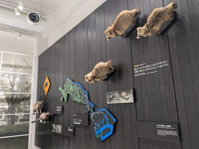 壁にはタヌキの剥製と出現マップ。タヌキは山の中だけでなく、エサを求めて川崎の街中にも出現するのです。よくみると、タヌキだけでなくハクビシンとアライグマも混じってます。