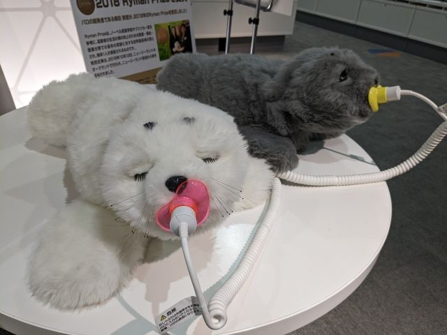 このアザラシのぬいぐるみはセラピー用ロボットの「パロ」。動物のように楽しみや安らぎの効果を与え、人の心を豊かにするために開発されたロボットです。人を認識し、コトバも理解しているそう。医療機関を中心に、世界に30ヶ国・5,000体が活躍しているとのことです。