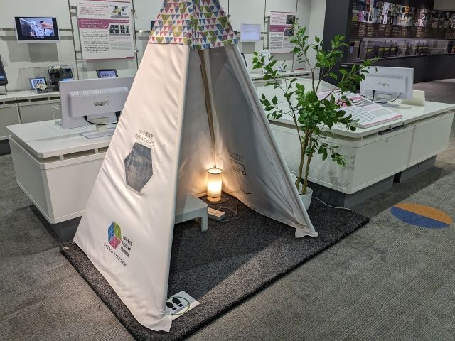 実はこのテント、「ファブリックスピーカー」という音が鳴る布でできています。伸縮性のある柔らかい布から、従来のスピーカーのように音を出すことができるというとんでもない素材。車の座席シートやスマートウェアへの活用が考えられているそうです。