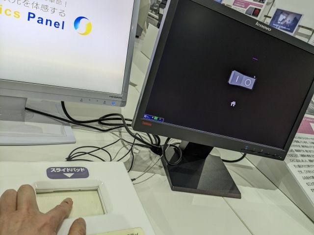 こちらは「3D触力技術」。スライドパッドでモニターのカーソルを操作するのですが、モニターに映るスイッチをオン・オフにしたり、ダイヤルをまわしたときに、実際のスイッチやダイヤルを操作しているような感覚を体験できます。