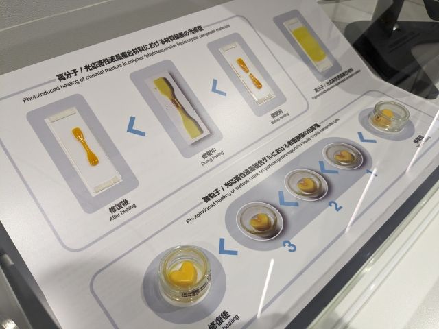 こちらは「光応答性ゲル」。堅いゲル状物質ですが、紫外線を当てることで流動性のあるゾルに変わります。この素材を活用すれば、表面のキズを光を当てるだけで自己修復してしまうのです。