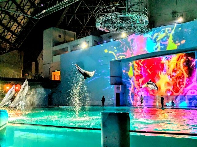 薄暗いスタジアム内が、華やかなプロジェクションマッピングで彩られます。カラフルな世界を飛び交うのはバンドウイルカやカマイルカ。