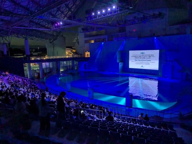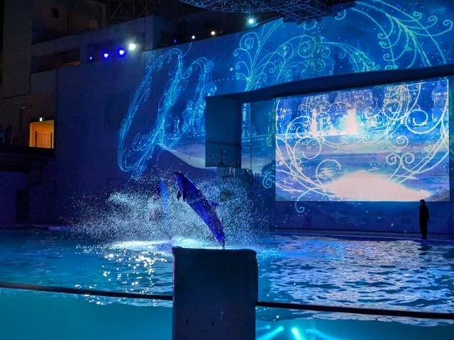 終盤に向けて盛り上がるBGM。ラストはプロジェクションマッピングとともにスピーディーに飛び交うイルカたちが登場。歓声の中、ショーは幕を閉じました。