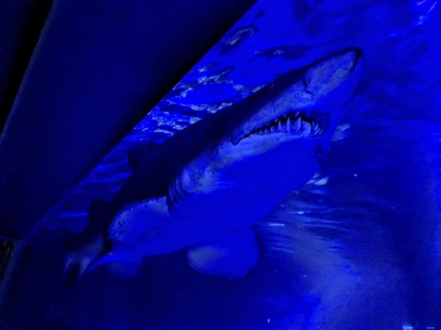 悠々と泳ぐのは大きなシロワニ。鋭い歯がびっしりと並んだ恐ろしい顔をしていますが、実は性格はとっても大人しく人を襲うことはありません。