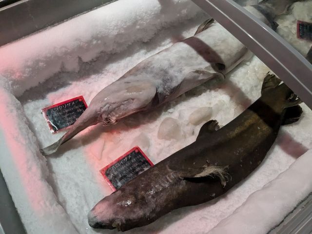 こちらはミツクリザメ、ヨロイザメ、ラブカの冷凍標本。なんとおさわりOK!!キンキンに凍ったサメハダや鋭い歯を実際にさわってみることができます。