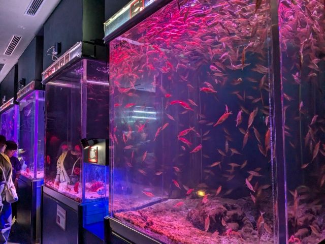 メジャーな生物だけでなく、マニアックな生き物も多数展示されています。深海生物のコーナーではダイオウグソクムシ、ボタンエビ、タカアシガニ、オオクチイシナギなどを見ることができます。薄暗いエリアに赤く照らされた水槽が並ぶ様子はちょっぴりスリリング。