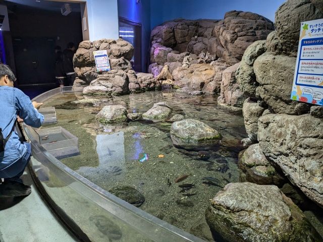 館内を進んでいくと、見えてくるのはタッチプール。東京湾の磯場が再現されており、オヤビッチャ、スズメダイ、ヒラメ、ハタタテダイなどが泳いでいます。