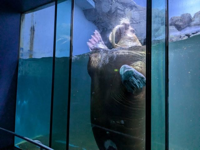 巨大なセイウチはちょうどごはんタイム。ガラスをばんばん叩いたり、バブルリングを放ったりとパフォーマンスも披露してくれました。
