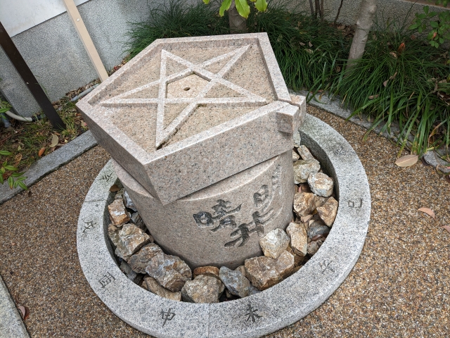 五芒星をモチーフにした五角形の井戸は、晴明が念力で水を湧かせたという伝説が残る晴明井。一角に水が流れる口があり、その年の恵方を向いています。毎年立春の日に向きが変わるそうです。