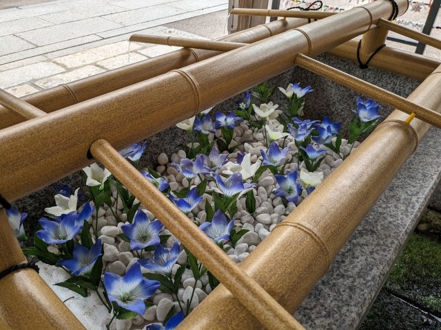 手水には造花のキキョウがたくさん。社紋である五芒星はキキョウの花をモチーフにしているといわれており、「晴明桔梗」とも呼ばれています。