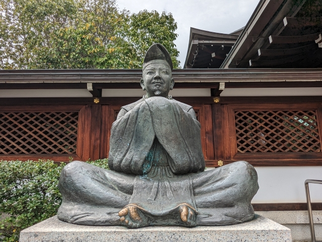 拝殿向かって左手に鎮座するのは安倍晴明公像。安倍晴明の肖像画を元に作成された像で、印を結んで天体観測を行う姿を現しています。陰陽師=不思議な術を使うというイメージが強いですが、実際の陰陽道は天文学や暦を知り、それを使って吉凶を占うというものであったそう。
