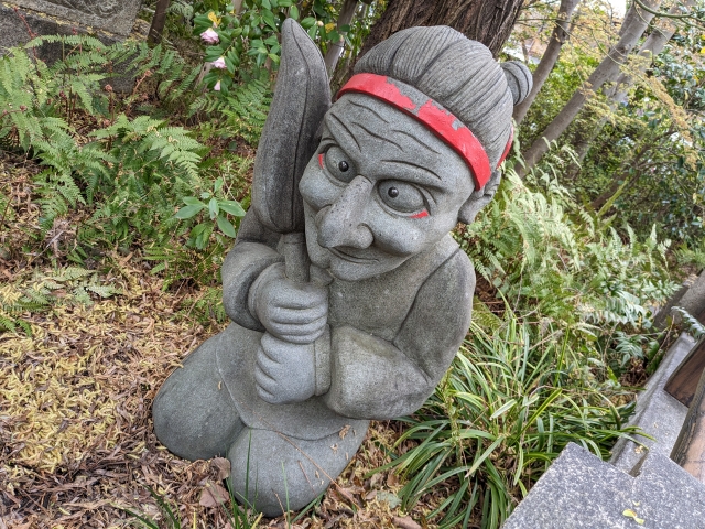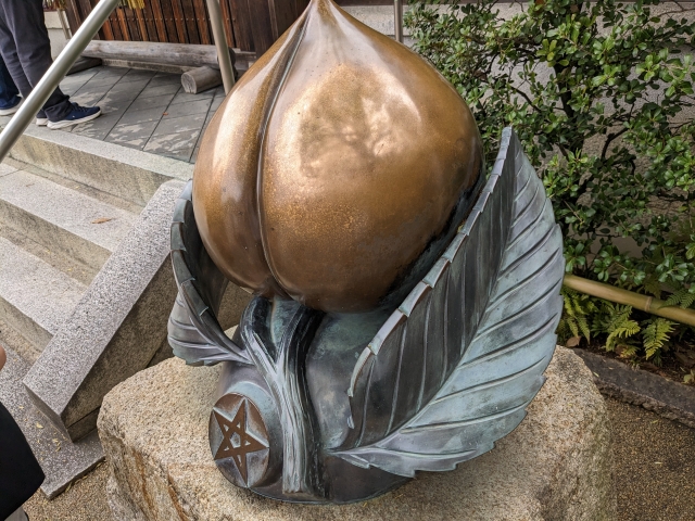 向かって右にはモモの像。陰陽道において桃は厄除け・魔除けの果物といわれており、このモモの像は厄除桃と呼ばれています。さわって厄を撫で付けることができるため、ぴかぴかな姿。授与所では、桃の厄除け守りも扱っていました。