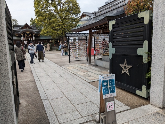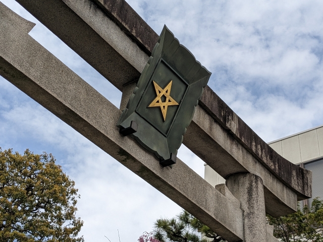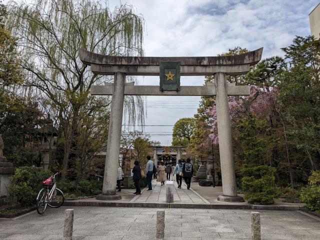 一の鳥居の扁額には社紋である「五芒星」が描かれています。この紋は、陰陽道に用いられる祈祷呪符のひとつ。
