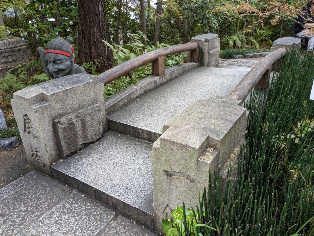 晴明は式神と呼ばれる精霊を使役していたとされていますが、奥さんが式神の顔を怖がったため日常では戻橋に隠していたそう。この再現された橋の傍にも式神の像が置かれていました。