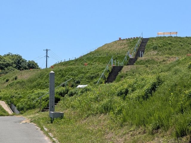 墳丘は整備されており、階段が設置されています。後円部を登ってみると、ずらりと並んだ円筒埴輪のお出迎え。