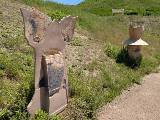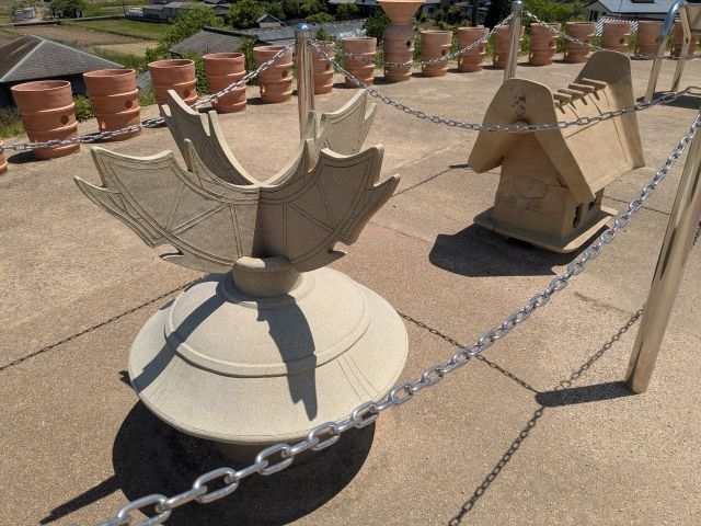 並んでいるのは円筒埴輪だけではありません。手前が蓋形(きぬがさがた)埴輪、奥が家形埴輪と呼ばれるタイプ。