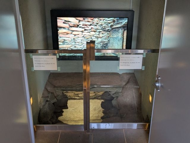 内部はキレイに整備されております。設置されたディスプレイには、安山岩を積み上げた玄室の映像が流れています。