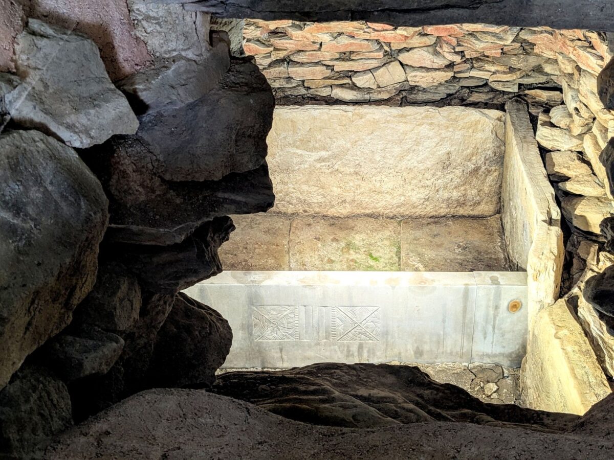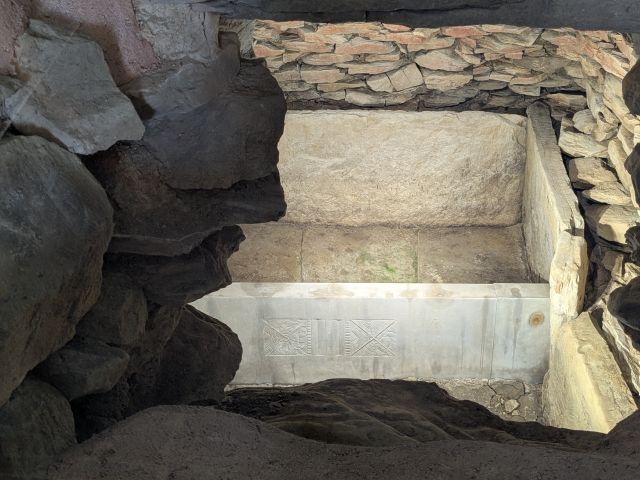 石室の奥を覗くと、石の壁に囲まれたスペースをちらっと見ることができます。こちらは「石障」と呼ばれる仕切り石の複製。
