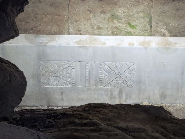 この石障に刻まれているのは不思議な文様。こちらは直線と帯状の弧線を複雑に組み合わせた「直弧文」という珍しい文様。