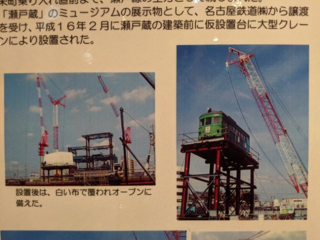 この車両は瀬戸蔵の建築に合わせて、クレーンで運び込まれました。当時の写真も掲載されており、まだ骨組みだけの建物の中に車両が組み込まれていく様子がわかります。