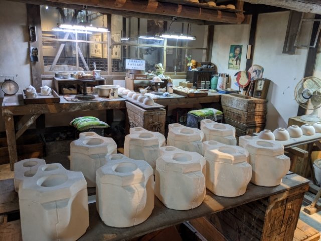 瀬戸といえば焼き物!昭和の町並みの中には「モロ」と呼ばれる焼き物工房が丸ごと再現されております。趣深い家屋からは、今にも陶工(焼物師)さんが出てきそうな雰囲気。