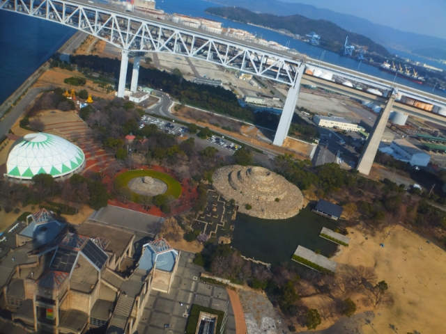 瀬戸大橋記念公園も一望できます。上から見ると、様々なモニュメントが置かれていることに気づきます。タワーを降りたらでめぐってみようかな。