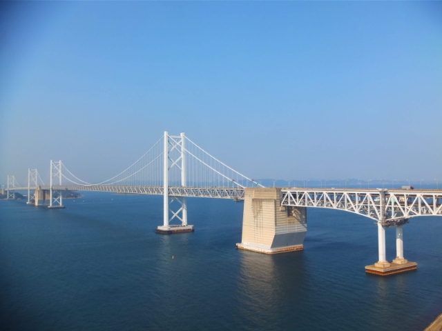 地上108mから見る瀬戸大橋。青い海と青い空に挟まれており、まるで境界を示すかのようです。