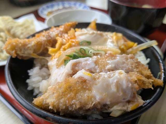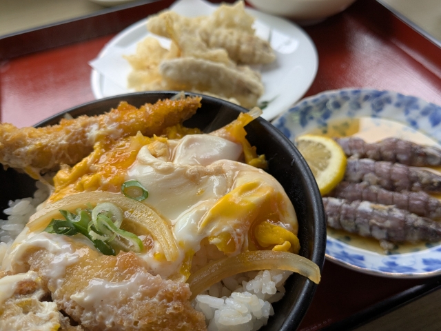 まずはシャコ丼から!フライのシャコが卵とじしてあり、一見するとカツ丼。ふんわりとしており、食感ひかえめなエビといった感じです。味付けはカツ丼なので、とっても美味しいです!