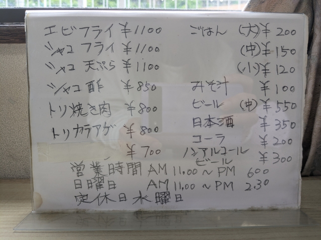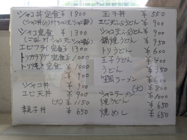 メニューはすべて手書きで、非常に味があります。「シャコ丼定食」「シャコ定食」「シャコ丼」「シャコラーメン」といったシャコ料理に加えて、「笠岡ラーメン」「鍋焼きうどん」「唐揚げ定食」などのメニューも。