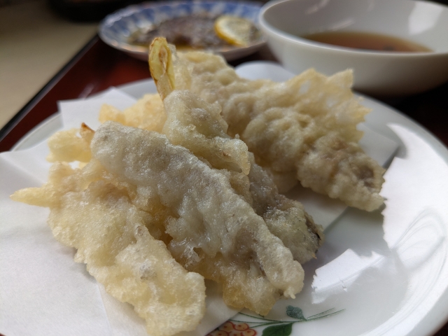 シャコ天ぷらも、フライ同様にふんわりした食感。食感こそエビ感はありますが、風味はエビよりもワカサギとか小魚に近い気がします。