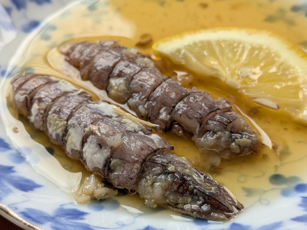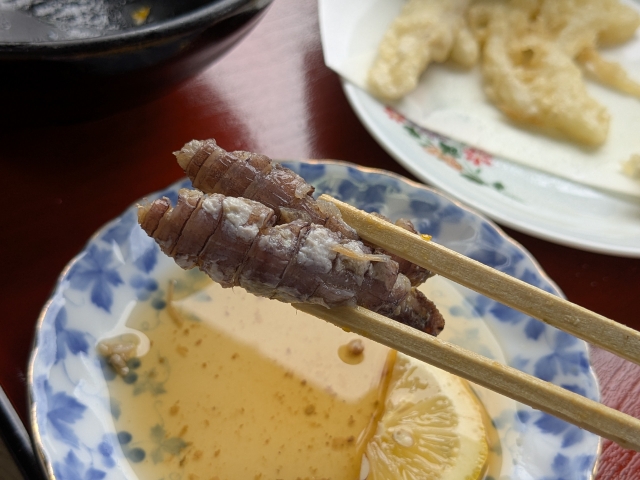 こちらはシャコ酢。天ぷらやフライとは異なる、インパクト抜群なルックス。薄紫がかった色味から、未確認生物、エイリアン、スペースワーム、そんな単語が頭の中に次々と浮かんできます。