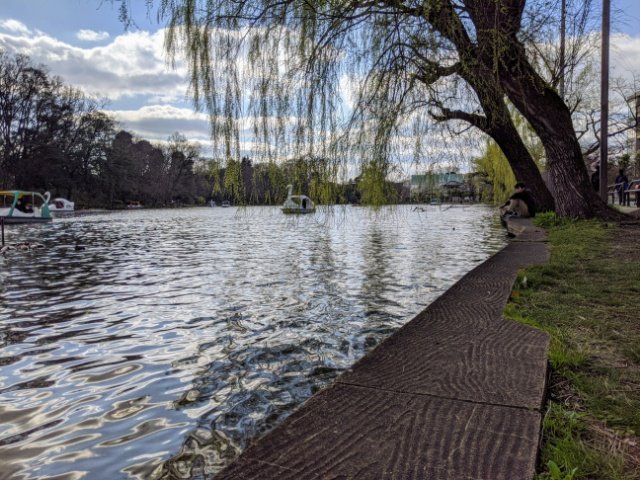 池の周りの遊歩道は垂れ下がる柳がとても良い雰囲気。そして、水面がとても近い!すぐ隣が池で土手も柵もないため、転んだら一瞬で水没していまいす。