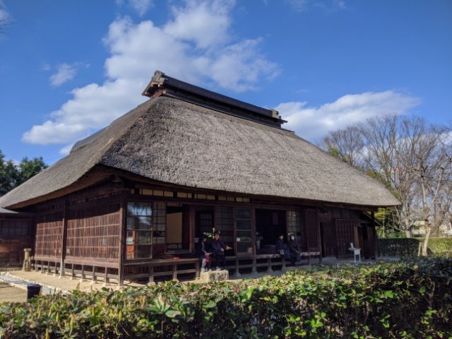 ふるさと文化館の隣にある池淵史跡公園は、旧石器時代の竪穴住居跡などが残る池淵遺跡を埋め戻し保存した公園。茅葺きの旧内田家住宅は、9:00〜18:00の間なら内部に入ることもできます。