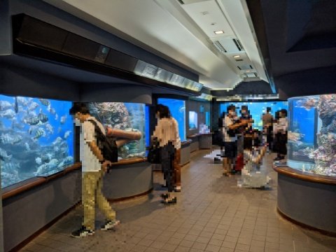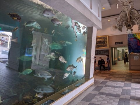 ヘダイやギンガメアジなど回遊魚が泳ぐ大水槽もあります。1m以上ありそうなロウニンアジも泳いでおり、なかなかの迫力です。