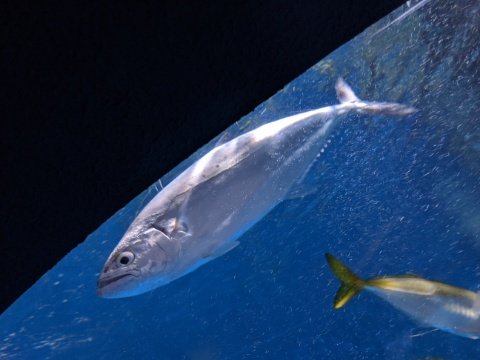 マアジに混じって泳ぐのはシルバーがきれいなイケカツオ。カツオはサバ科の魚ですが、このイケカツオはアジ科に属しているためカツオではありません。大きくなると60cmにもなるそう。