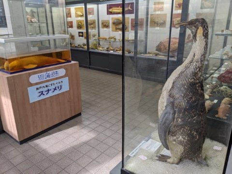 バリエーション豊かな貝殻やフグなどおなじみな標本に加えて、コウテイペンギンやスナメリなどレアな生き物の剥製も。もしかしてスナメリは、かつて飼育されていた個体でしょうか。