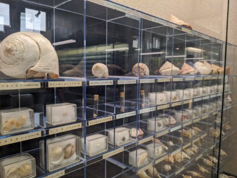 サカナの剥製や貝殻標本が並ぶ展示室もあります。ショーケースに様々な標本が並ぶ様子は、ちょっとした海洋ミュージアムのよう・・・この渋川マリン水族館の正式名称は「玉野市立玉野海洋博物館」。れっきとした海洋博物館でした。